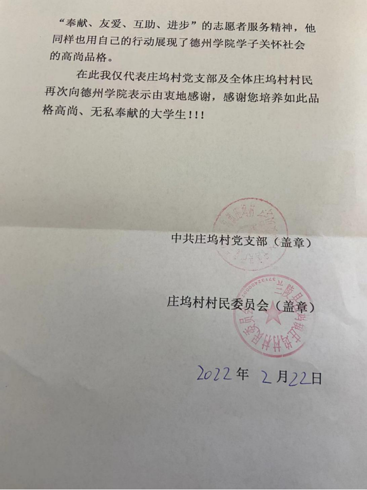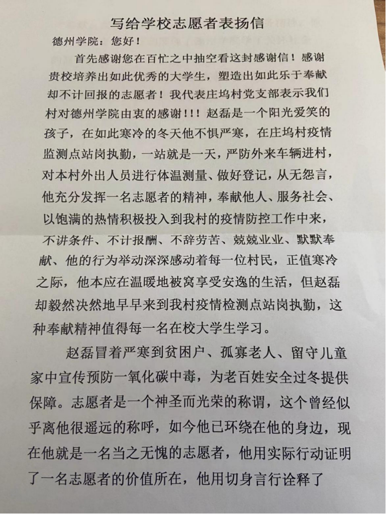 近日,英国be365官网收到一封来自山东省临沂市兰陵县庄坞镇庄坞村党支部的表扬信。信中对英国be365官网赵磊同学在寒假期间积极参与疫情防控等志愿工作给予了高度评价,表达了诚挚的感谢。