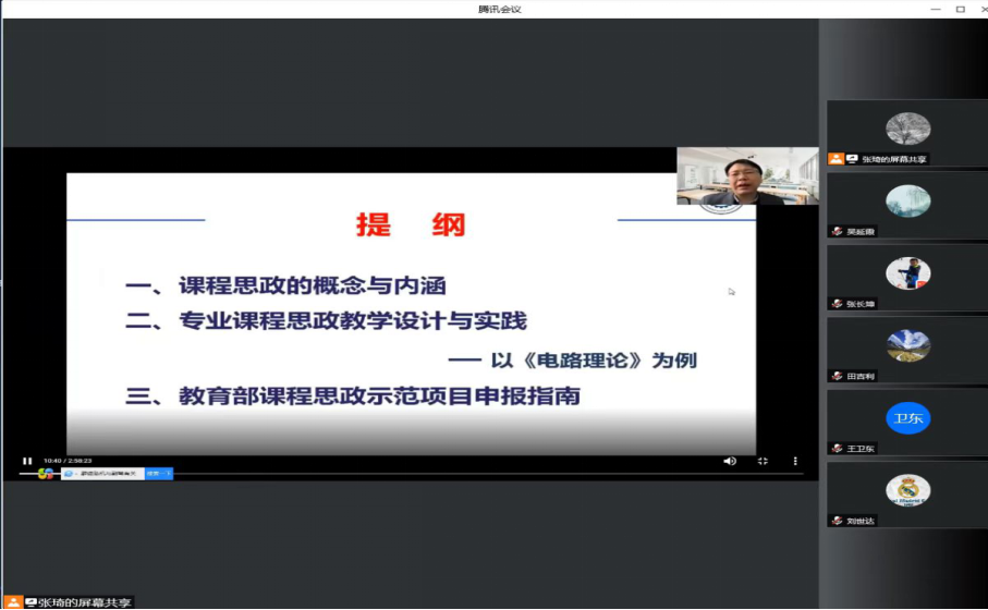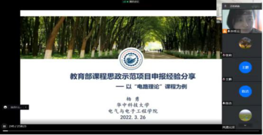在本次教学研讨会上,全体任课教师集中学习了《习近平总书记在北京冬奥会冬残奥会表彰大会上的重要讲话》,接着进行了课程思政在线培训。集中学习了清华大学马昱春老师的《专业课实施课程思政的原则与教学设计方法》,了解什么是真正的课程思政,如何寻找课程思政元素,以及如何在专业课这个载体中融入课程思政元素,从而达到育人效果。又集中学习了华中科技大学的杨勇教授做的课程思政示范项目申报经验报告。报告首先介绍了国家对课程思政课程的政策,然后讲解了电路课程的课程思政建设及思政教学案例,最后介绍了课程思政项目申报书的书写经验。