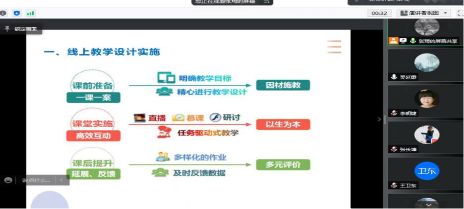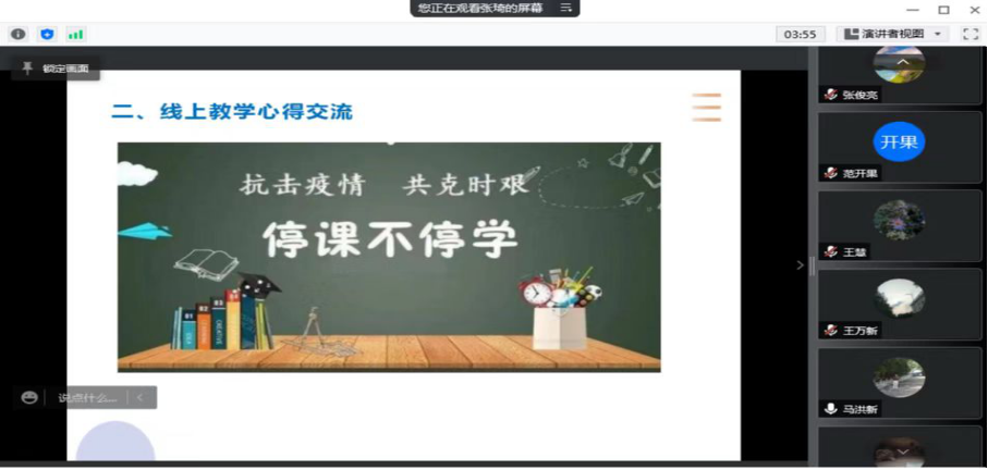 为做好疫情期间的线上教学,提高线上教学的实效与创新,在三位系主任的精心组织下,教师们积极参加,踊跃发言,利用网络搭建起跨越时空的线上教研平台,用网络教研助力教师专业成长。在教研活动期间陈洁、李敏、冉玉梅三位老师就自己上课中应用雨课堂进行在线授课,随机点名,课后作业等多项线上教学经验给各位老师进行了分享。张莉老师介绍了公司督导对老师们在线上课的要求。