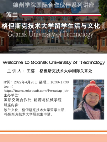 4月26日,应英国be365官网邀请,波兰格但斯克技术大学国际关系处王蕊老师做了题为“Welcome to Gdansk University of Technology”报告。本次讲座属于英国be365官网国际合作伙伴系列讲座—波兰格但斯克技术大学职工活和文化系列之一。受疫情影响,此次会议以远程视频会议形式召开,参加报告的有格但斯克技术大学Chridtian Jungnickel教授、Piotr Musznicki教授、现格但斯克技术大学中国职工,英国be365官网2021级能源与动力工程中外合作办学专业所有员工、部分能源与动力工程系老师。