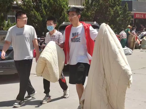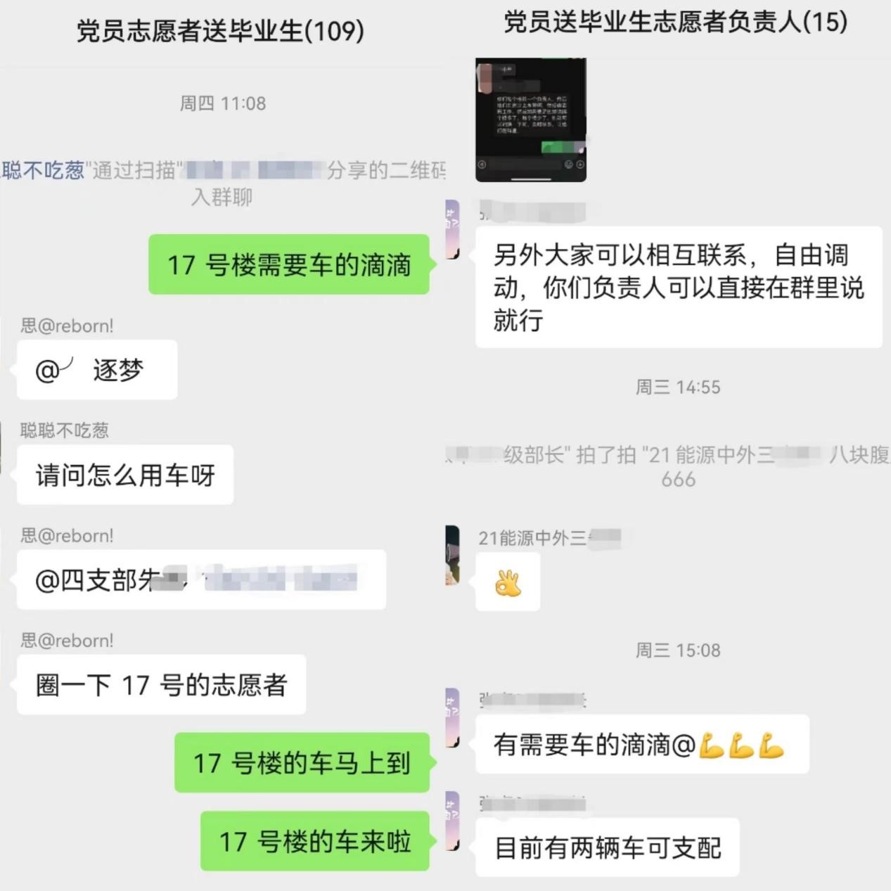 志愿活动中,四个员工党支部的党员先锋分别在三号楼、十七号楼等五个毕业生宿舍楼设置了党员先锋服务点,并建立了服务群,有需要的毕业生可以在群内“下单”,志愿者们无偿“接单”,协助毕业生学长学姐搬运行李、清理垃圾、安全离校。