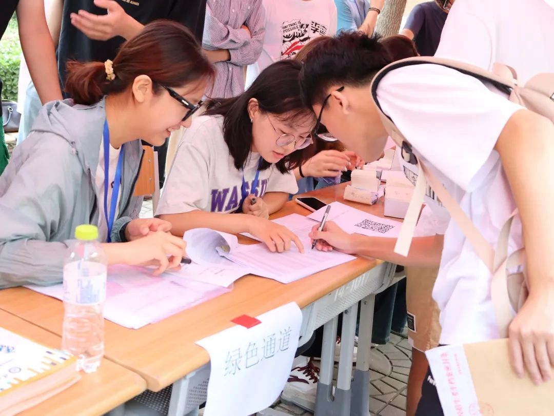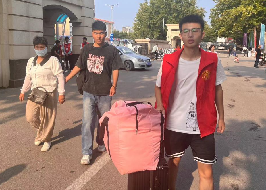 “同学,三号宿舍楼在这里右转”,“同学,我帮你拿行李!”“先来这里报到哦~”一声声热情的问候,一道道鲜亮的红色身影,共同构成了校园中靓丽的风景。