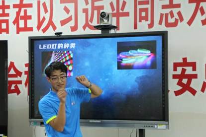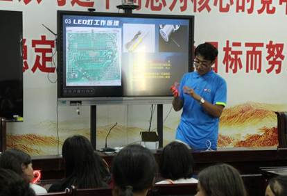 课堂上,支教团成员范志鸿用简单易懂的语言介绍了LED灯——一种小巧、省电又耐用的灯,并详细介绍其概念、种类和工作原理,它比普通白炽灯更节能,相同亮度下耗电量仅为白炽灯的1/10。大家还看到了照明用的球泡灯、装饰用的灯带等多种LED灯,眼界大开。