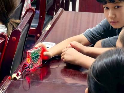 最让人眼前一亮的是心形流水灯,支教团成员告诉孩子们:“这个心形灯可不是买来就会闪的哦!它的灯光能像流水一样变幻,全是靠编程实现的——就像给灯‘写指令’,告诉它按照我们的要求进行亮、闪、连续、分层等变化,它才会变成现在看到的样子,这也是我们特意为大家设计的爱心形状。”