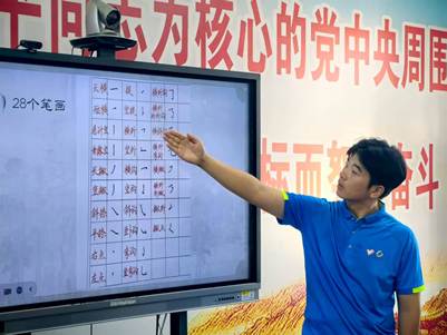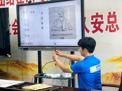 上午,支教团成员翟继翔先给小朋友们讲书法基础和历史,孩子们被汉字魅力吸引,听得入神。接着他讲解握笔姿势和笔画技巧,并拿起毛笔演示:横画起笔如“小鸟啄食”,平稳行笔、回峰收笔;竖画似“小树扎根”,垂直向下,收笔或尖或圆。生动的比喻让孩子们轻松理解,跟着模仿。