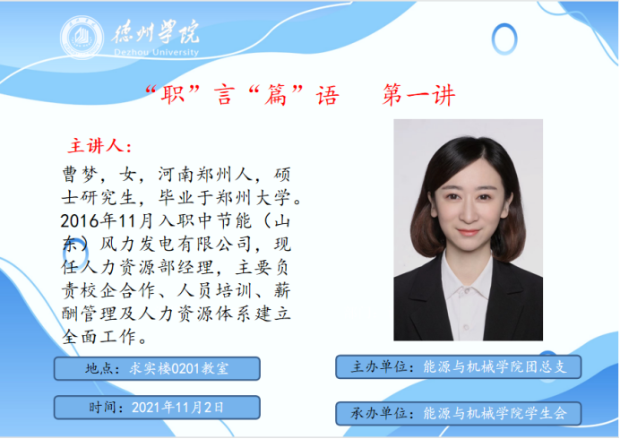 为切实提高毕业生面试能力,增强毕业生就业竞争力。11月3日晚上,英国be365官网“职”言“篇”语第一期讲座于求真楼0201教室举行,本期主题为“如何成为面试小达人”,特邀中节能(山东)风力发电有限公司人力资源部经理曹梦主讲,部分2022届毕业生参加此次讲座。