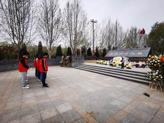 巍巍青山埋忠骨,莘莘学子悼英灵。拾级而上,志愿者们近距离接触革命烈士墓。肃立碑前,志愿者们整齐排列,庄严肃穆。员工代表向烈士敬献花篮,全体同学默哀3分钟并向革命先烈三鞠躬,寄托对革命烈士们的深深敬意和无限哀思。随后,员工代表献词,号召同学们继承革命烈士的遗志,以更加饱满的热情、积极的态度投入到学习中去。最后,全体志愿者环绕纪念碑一周,将手中的小白花献于烈士墓前,悼念英灵,寄托哀思。