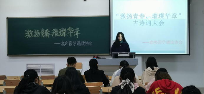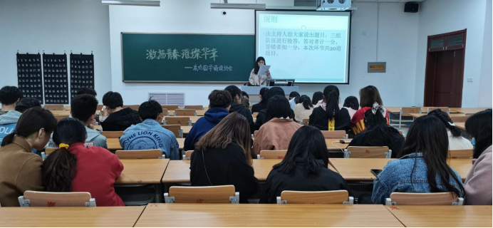 诗歌是语言的精髓,是情感的寄托和心灵的家园。2021年4月3日,鹿鸣国学诵读协会于东校区明理楼0255举办“激扬青春,璀璨华章”古诗词大会。鹿鸣国学诵读协会全体成员参与了此次活动。