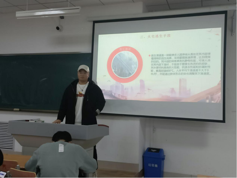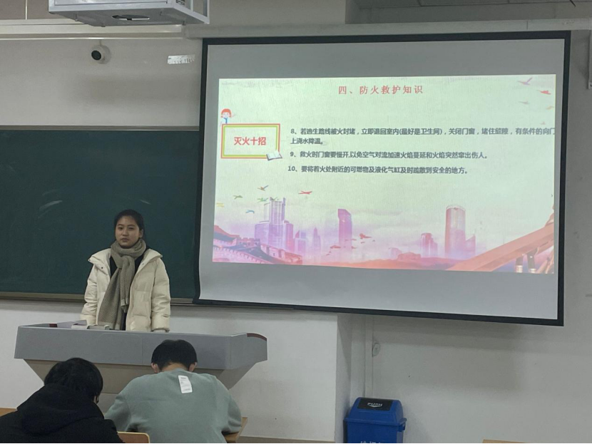 本次活动是通过展示PPT的形式,从灭火器和消防栓的使用方法、火灾逃生手段、宿舍内防火救护知识三个方面进行了主题宣讲。宣讲过程中,宣讲人向同学们介绍了宿舍内不同类型的消防安全用品及其使用方法,重点讲解了在火灾发生时不同形势下应采取的自救手段,提升同学们在紧急状态下的自救逃生技能。同时,本着“预防为主,防消结合”的方针,严格禁止同学们在宿舍内吸烟、使用大功率电器、存放易燃易爆物品等,要求同学们熟知宿舍内的消防设备及应急逃生路线,结合公司组织的消防安全演练,加深对消防安全知识的了解。