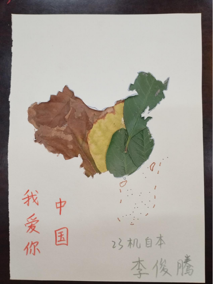 “这幅《我爱你 中国》是我的作品,片叶之间,也有情怀万千,我在德院。为我们的大中国比耶!”