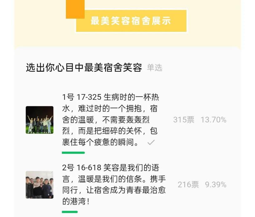 在第二轮评选中,借助线上平台开展全民投票活动。参赛的30个优秀宿舍作品集中展示,吸引了4000 + 的浏览量。广大师生及社会公众可通过专属投票通道,从创意度、感染力、画面质感等维度,为心仪的作品投票。投票过程公平、公正、公开,最终根据投票结果确定获奖宿舍。