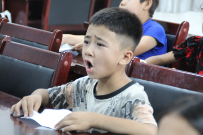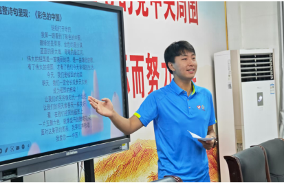 课堂上,支教团成员张粟凯以播音主持知识为基石,引领孩子们走进《彩色的中国》。从逐句示范的细致到情感引导的真挚,孩子们用清澈童声勾勒出祖国山河的壮阔图景,这不仅是对文字的理解,更是边疆孩童与祖国大地的心灵共鸣——每一个发音的纠正、每一次情感的递进,都在悄然搭建起个体与家国的精神桥梁。