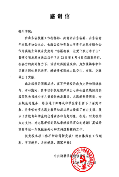 团队与当地因支教结下的纽带,不仅是情感的联结,更像是一束跨越山海的光,既照亮了孩子们的成长之路,也让这份融合着文化传承、科学启蒙与家国教育的温暖,成为可延续的力量,在彼此心中留下关于责任与守望的深刻印记,为更长远的双向奔赴埋下伏笔。喀什疏勒县特意发来的感谢信中,字里行间满是真挚的感恩。这份认可,恰是对这份双向奔赴最好的见证,让责任与守望的印记愈发清晰,也让这份温暖的力量有了更长久的延续。