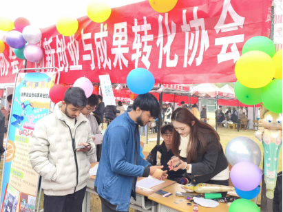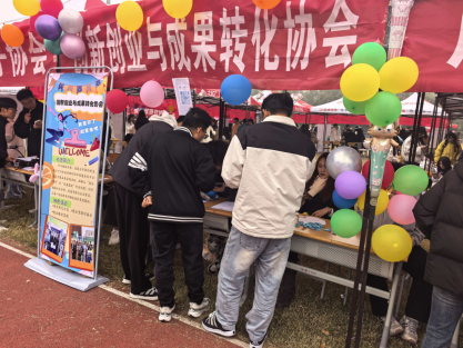 在创新创业与成果转化协会的招新现场,红色的协会横幅醒目亮眼,五彩斑斓的气球将摊位装扮得活力四射。协会成员耐心介绍社团简介及培训内容,帮助同学们更好的了解社团情况。招新现场还吸引了来自不同国家的员工,社团工作人员正耐心且热情地向外国同学介绍社团的创新创业项目成果,他对此十分感兴趣并表示非常乐意加入我们。