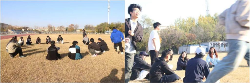 “丢手绢”活动中,开始全体同学围坐成圈,一人手持“白色手绢”在圈外慢跑,持手绢者可任意将手绢丢在某同学身后,丢完后迅速逃跑,被丢者发现手绢后起身追赶。若持手绢者成功跑回被丢者的空位坐下,被丢者成为新的持手绢者;若被追上,持手绢者需接受“惩罚”,“追逐”与“被追逐”的互动,天然地打破了社交距离,欢声笑语中,同学们的压力得到释放。