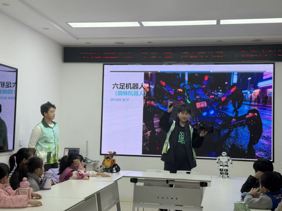 活动伊始,志愿者们并非进行枯燥的理论灌输,而是通过精心设计的趣味课件和琳琅满目的实物展示,构建了一个充满奇思妙想的科技世界。活动在《机器人总动员》的片段放映中拉开序幕。当屏幕上的瓦力切换成讲台上的瓦力机器人时,孩子们的眼睛瞬间亮了。随后登场的是Spiderbot六足机器人,这只机械蜘蛛不仅外表像蜘蛛,更能模仿生物的爬行姿态。孩子们的讨论声此起彼伏。志愿者用浅显易懂的语言,将这些复杂机器的工作原理与生活中的实际应用联系起来,引导孩子们思考科技如何改变未来。面对孩子们天马行空却又充满求知欲的提问,志愿者们一一耐心解答,思维的碰撞让理论的宣讲变得火花四溅。