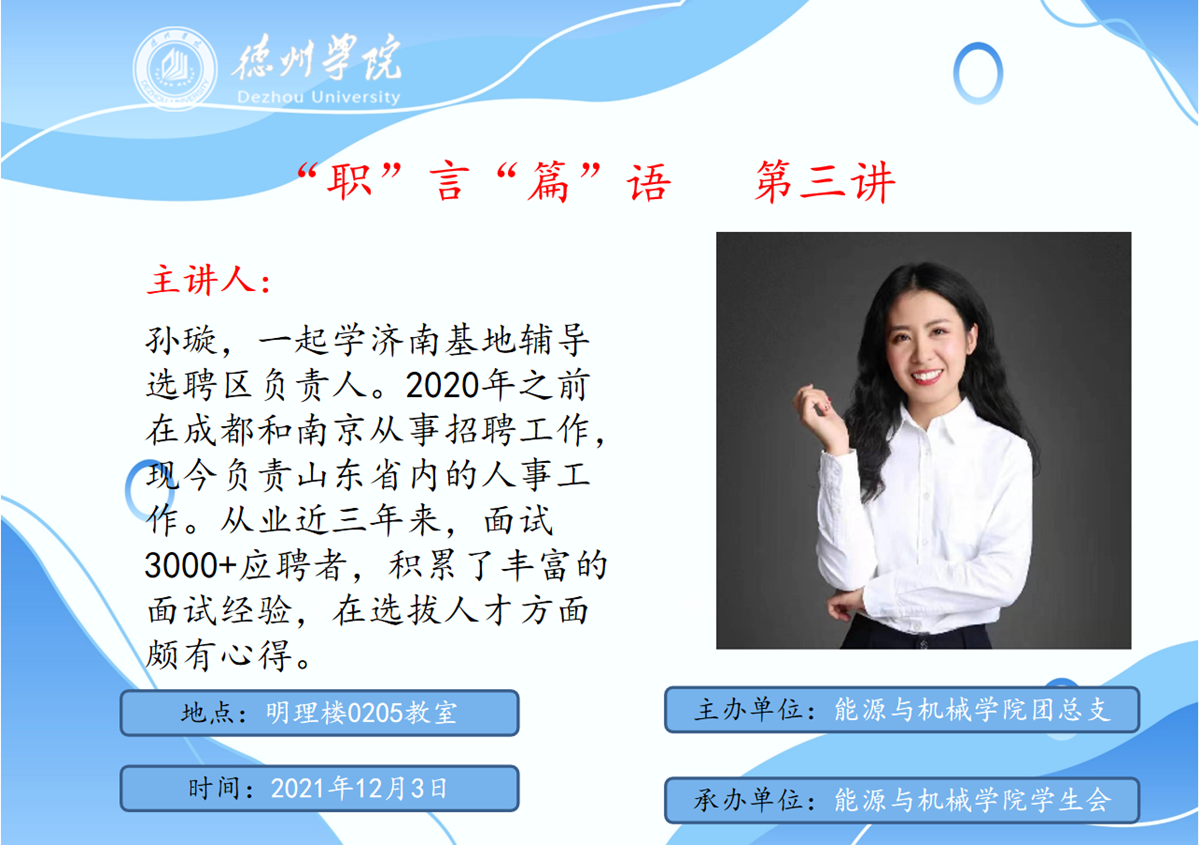 12月3日下午,英国be365官网“职”言“篇”语第三期于明理楼0205教室举行,本期主题为“如何玩转简历制作”,特邀一起学济南基地辅导选聘区域负责人孙璇老师线上主讲,部分2022届毕业生参加此次活动