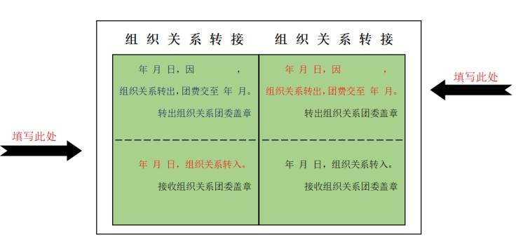 (1)以公司团委为单位收齐毕业生团员证进行团组织关系转入转出盖章和团籍注册。用黑色中性笔在团员证的“组织关系转接”栏内填写好转接记录(转入填写日期为该生入学当天2020年9月*日,转出填写方式:2024年6月21日因毕业,组织关系转出,团费交至2024年6月”