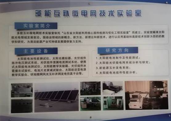 多能互补微电网技术实验室依托山东省工程实验室“太阳能利用核心部件检测与优化工程实验室”而建立, 约400余m2。实验室瞄准太阳能光电领域发展前沿,围绕该领域的新概念、新方法、新理论和新技术,进行以应用基础和高新技术创新为目的的教学和研究,为清洁能源产业可持续发展提供智力支持实验室拥有太阳能电池性能测试仪、太阳光模拟器、光伏组件脉冲电压测试系统、光伏组件湿漏电流测试系统、便携式太阳能电池测试仪、太阳能教学实验箱、光伏组件冰雹撞击试验机、电池片光衰减试验台、太阳能逆变电源教学实验台、研旭微网风光互补并网发电仿真平台等教学、科研设备,共计180余万元。