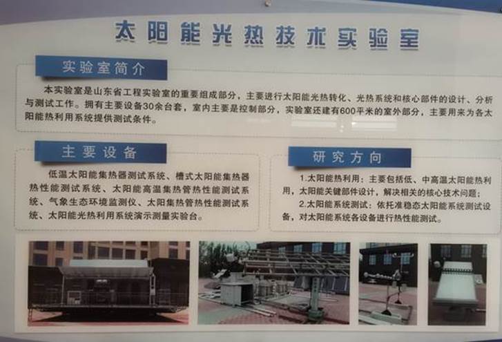 主要设备:低温太阳能集热器测试系统、槽式太阳能集热器热性能测试系统、太阳能高温集热管热性能测试系统、气象生态环境监测仪、太阳集热管热性能测试系统、太阳能光热利用系统演示测量实验台。